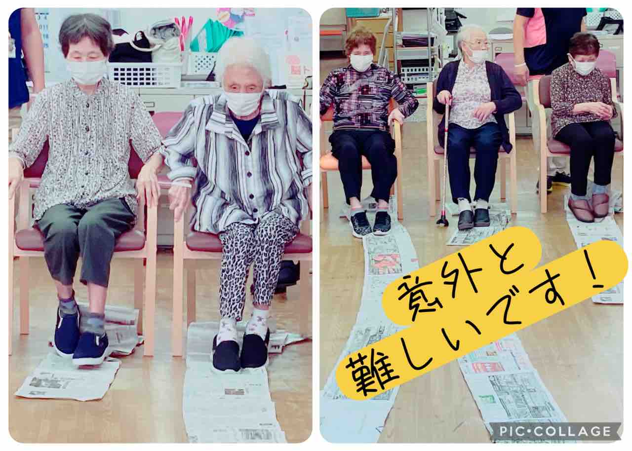 長くつなげた新聞紙を、椅子や車椅子に座ったまま足でたぐり寄せる競技です‼️