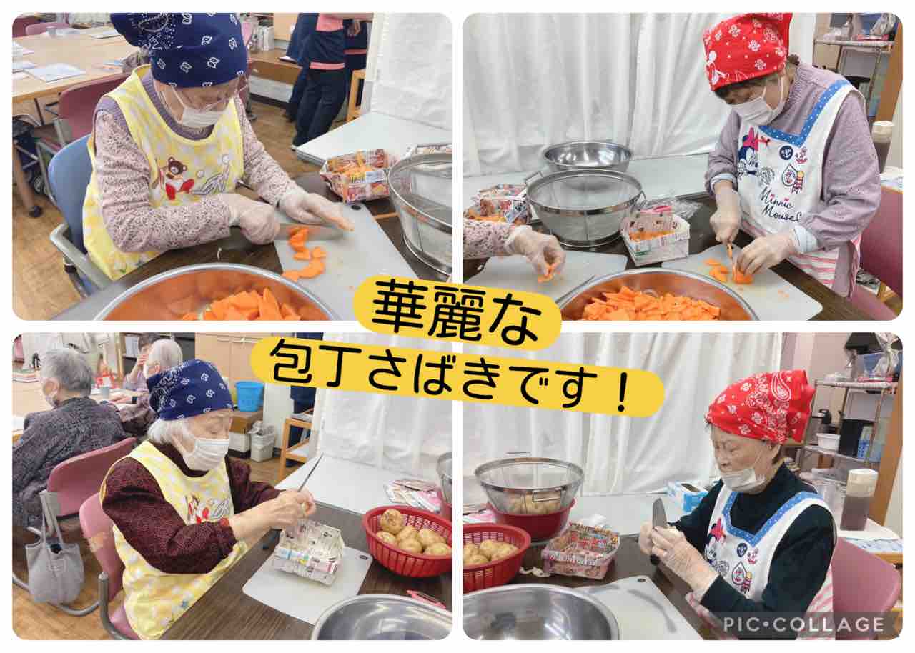 エプロンと三角巾で準備万端、にんじんやじゃがいもを手際よく