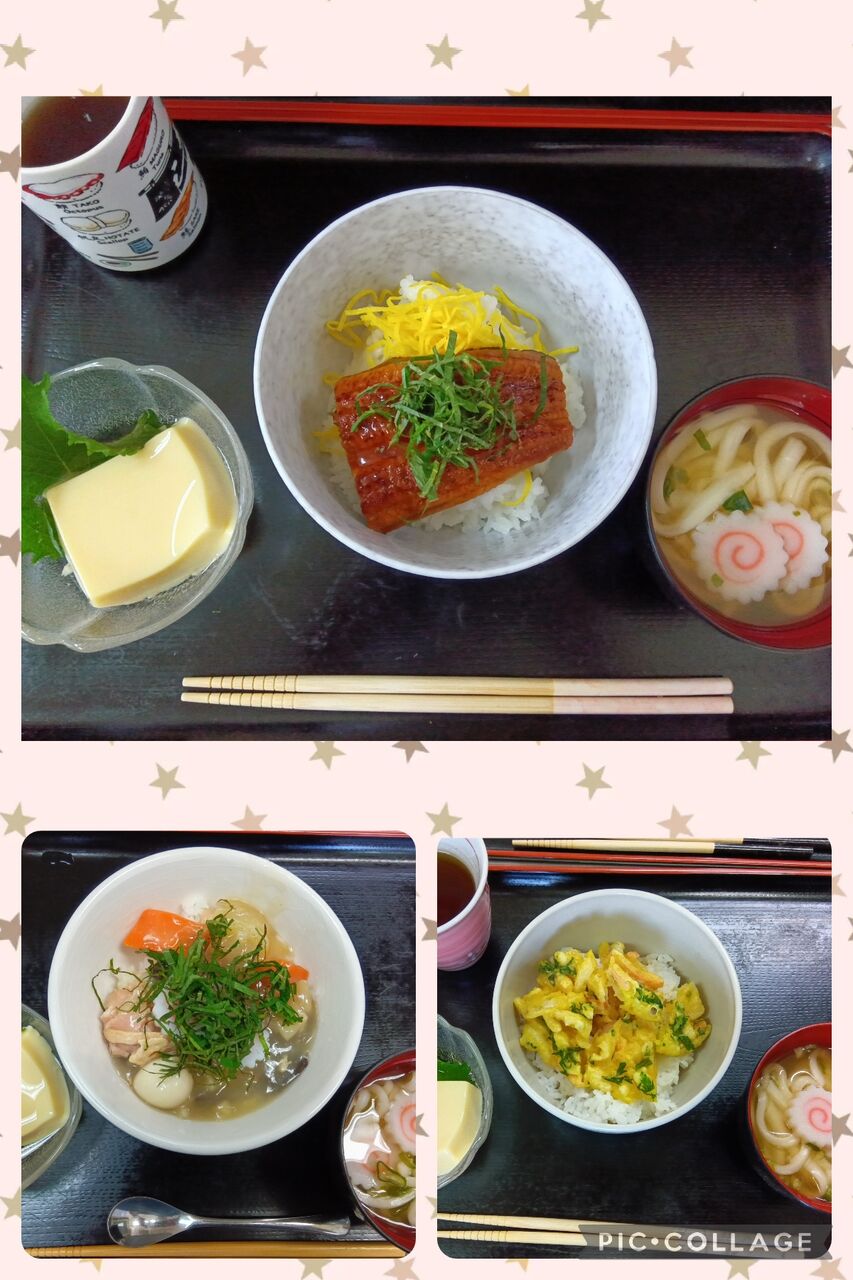 そうですうなぎです うなぎが苦手な方には、かきあげ丼・中華丼をご用意しました えんむすび事業所より、頂きました「しその葉」を卵豆腐やうなぎにも添えて・・・