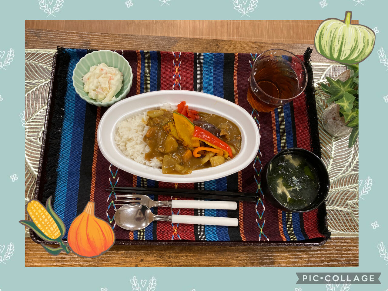 夏野菜カレー🍛 わかめと卵のスープ🥚 ポテマカサラダ🥗