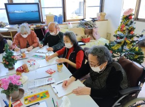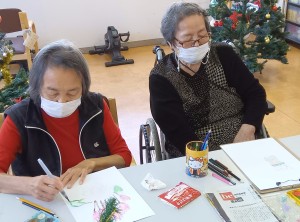 雪だるまなど、クリスマスにちなんだものを描きました。